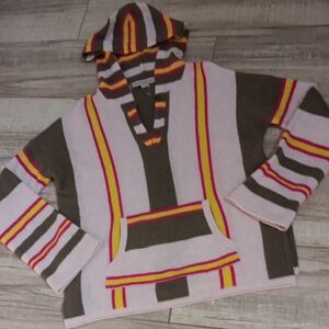 NWOT...COLORS ARE PALE DUSTY ROSE/OLIVE..YELLOW/HOT PINK STRIPES..HOODIE..KANGAROO POCKET..FABRIC TAG IN PICS...LIGHTWEIGHT CASHMERE..VERY NICE!! SIZE SMALL..BUT A LITTLE OVERSIZED..MEASURES FLAT ACROSS 21..LENGTH 26