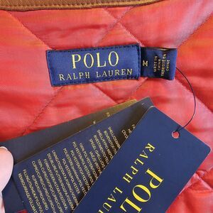 Features a collarless neckline, full zip front, and lamb leather trim including the belt. Fully quilted and lined for light warmth without bulk. New with original tags, never worn. Retail $498. Modern Polo Ralph Lauren collection.