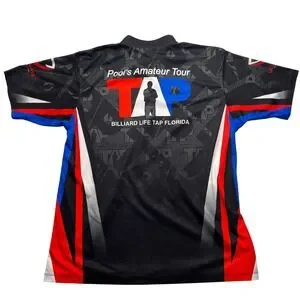 Keywords: Billiards, Pool Player, TAP League, Amateur Tour, Florida Billiards, Sports Jersey, Performance Top, Dart Shirt Style, Tournament Wear, Athletic Polo, Sublimated Print, Team Gear