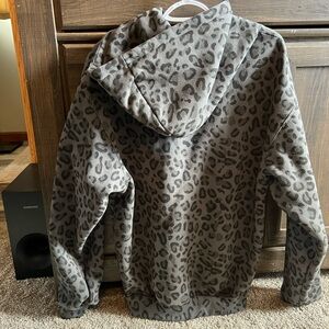 Oversized Comfrt gray and black leopard print hoodie with front pocket.