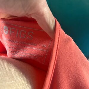 Coral scrub set by Figs. Includes top and pants. Lime drawstring adds a vibrant touch.