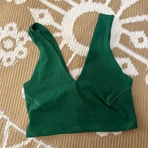 Stylish green sports bra. Deep V-neck design. Comfortable fit.