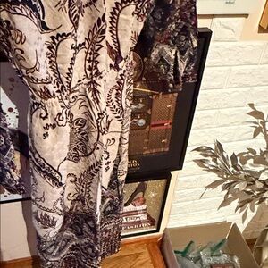 Chic long sleeve dress with intricate patterns. Features a blend of beige and black. Ideal for versatile styling.