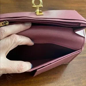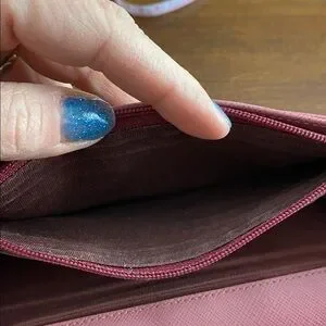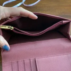 This elegant mauve wallet is perfect for any occasion. Its sleek design and vibrant color make it a stylish accessory. Does have wear, see pictures.