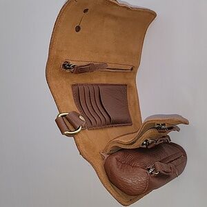 It is convenient to take personal effects whenever you go. The leather is buttery soft in a chestnut brown color with brushed brass hardware.