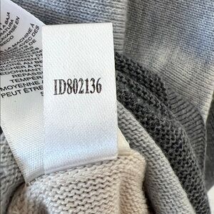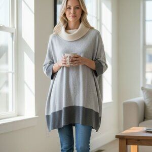Chic cowl neck design. Soft gray and cream tones. Ideal for layering.