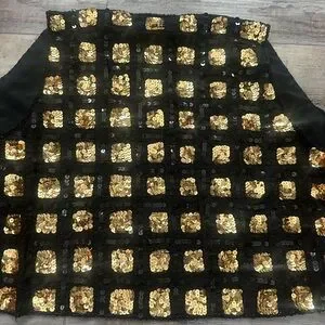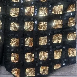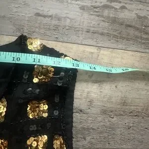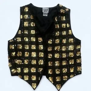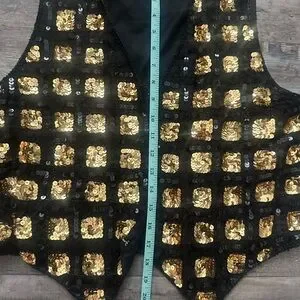 This vintage 1970s 100% silk black and gold beaded and sequined size M vest is a stylish and unique piece perfect for various occasions. The sleeveless vest features a hook & loop closure and a check pattern, giving it a retro and colorful 70s vibe. Made from lightweight silk fabric, this collarless vest is ideal for all seasons and can be worn for travel, parties, or casual outings. With its limited edition design and regular fit, this vest is a standout addition to any woman's wardrobe. Length: 17” at closure, 20” at tip Pit to pit: 19” Shoulders: 13”