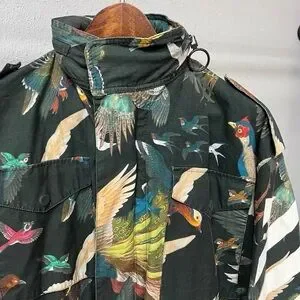 Men's jacket with vibrant bird motifs. Distinctive white diagonal stripes on sleeves. Perfect for a bold style statement.