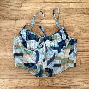 Stylish plaid crop top. Features adjustable straps. Perfect for casual wear.