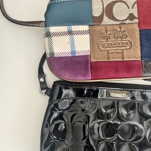 Elegant Coach wristlets in signature patterns. Includes black patent, gray monogram, and colorful patchwork designs. Perfect for versatile styling.