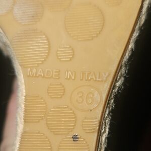 Stylish black espadrille wedges. Features peep-toe design. Perfect for casual elegance.