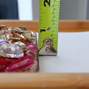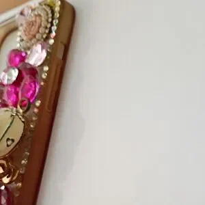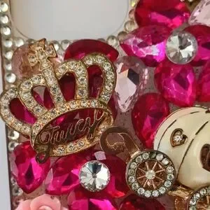 Elegant phone case with vibrant pink gems and gold accents. Features Juicy Couture crown and carriage designs.