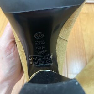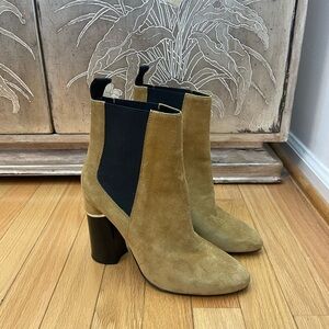 Elegant camel suede boots with contrasting black panels. Ideal for any occasion. Like new with exception of minor pictured scuffs.