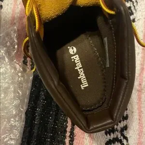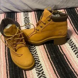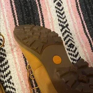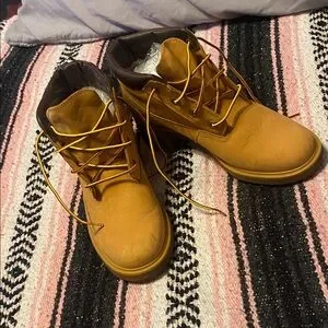 Rugged Timberland boots with sturdy laces. Chunky sole for traction.