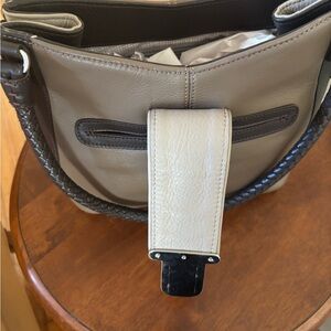 Appropriately 10”w x 11h brown leather tote bag with leopard print calf accents and expandable sides. Never used.