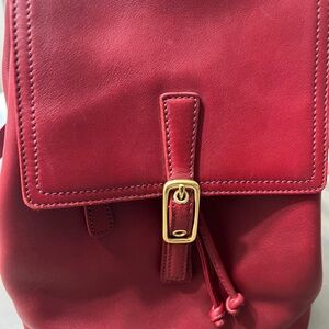 Chic cherry red leather backpack by Coach. Features a classic flap with buckle detail. Ideal for everyday use.