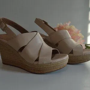Clarks Amelia Dally Ecru Leather Espadrille Wedge Sandals