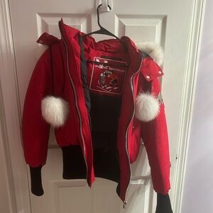 Bright red Mooseknuckle Women’s Large runs small bomber jacket, with white fur. Great a condition, non smoker home.