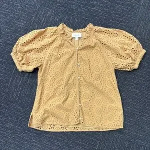 Stylish tan blouse with intricate eyelet design. Features button-down front and puff sleeves. Ideal for casual elegance.