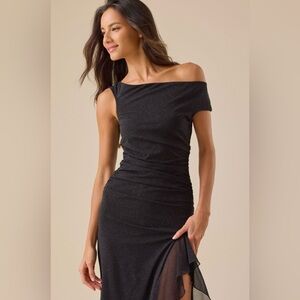 Elegant off-shoulder design. Ruffled side slit. Perfect for evening wear.