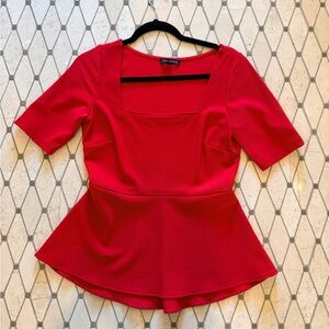 Chic red peplum blouse with square neckline. Short sleeves add elegance. Perfect for stylish outings.