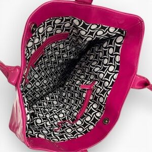 old statement tote by Style & Co in a vibrant hot pink glossy patent finish with a roomy interior and black/white geometric print lining.