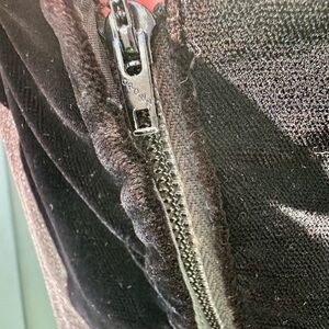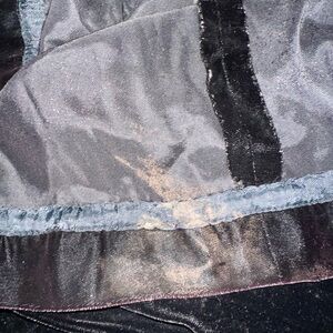 She’s been loved well. The straps need to be resewn, the lining appears to have sun damage (or maybe has a purple tint) and part of the criss-cross satin trim has come undone. One strap is hanging on with a knot, threads, and a prayer. Side zipper by “Crown”. Interior lining is intact, but at the hem there is a mark/stain/discoloration that i have not tried to remove. Sold as is