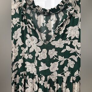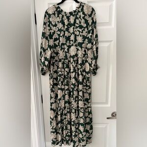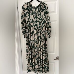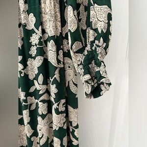 From Zara this is a beauitful half sleeve length, maxi length dress. Featuring a flowy silhouette, open neckline and seam at the waist to nip in and give shape. Flows out from there into a full skirt portion with a ruffle seam and detail towards the bottom.