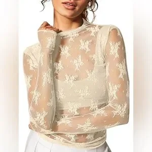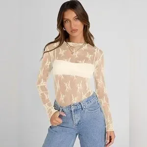Elevate your style with this elegant cream sheer lace top. Perfect for any occasion, this top offers a sophisticated and chic look.