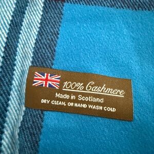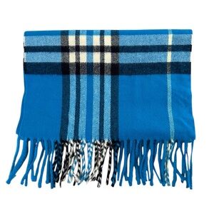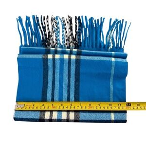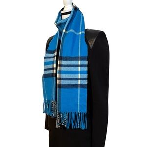 Stylish Cashmere blue plaid scarf with fringe detailing. Very soft.
