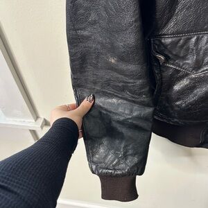 Such a cool vintage L.L bean find. I’d estimate about 70s. 100% genuine leather with real shearling lining and collar. Minor discoloration around zipper and some on the sleeves. Zipper and magnetic pockets still fully functioning. The lining in is amazing shape. Says size 40long I’d say fits a women’s large men’s medium. Check measurements below for more details.