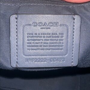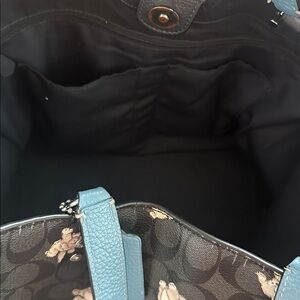 Chic Coach tote with playful dog pattern. Black and blue accents. Ideal for daily use. Color change on logo and crack on the top part around bag