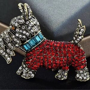 Add a touch of sparkle to your outfit with this charming red and silver dog brooch. Perfect for dog lovers and fashion enthusiasts alike.