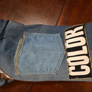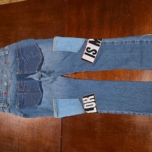 These jeans were upcycled from size 6 womans jeans cotton / spandex blend. These are one of a kind jeans: hand made glitter word patches from t-shirts with embroidered pockets. These kids jeans have added pockets for those extra things kids like to carry. The jeans are not hemmed to allow for rolling up or down for your growing child.
