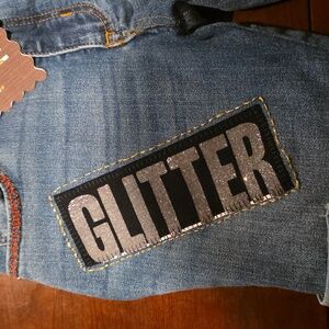 Upcycled Molly Made It stylish kids denim jeans featuring colorful glitter patches. Perfect for a playful and trendy look.