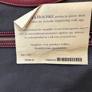 The top zip opens to a bright red fabric interior with ample space for daily essentials, while the exterior zip pocket adds easy access storage. Includes original Dooney & Bourke registration card.