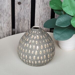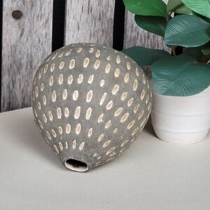 Elegant gray vase with cream dotted texture. Perfect for modern decor.