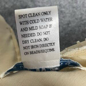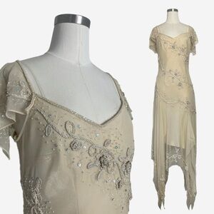 Excellent preowned vintage condition. Minor pilling on inside lining. Not noticeable from outside. See last photo. There might be a few beads missing but overall everything seems intact. Nude/champagne sheer mesh dress. Sheer flutter sleeves. V-neck. Bias cut. Asymmetric handkerchief style hemline. Covered in beads, silver sequins, and 3D crochet rosettes. Attached slip underneath has shiny iridescent sheen to it. Zips up the side. Tagged a 10 but runs small since it’s vintage. Fits more like a 4/6/small. Please refer to measurements.