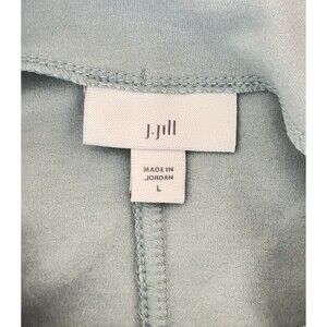 The J. Jill Women's Aqua Long Sleeve Mock Neck Top is a stylish and comfortable blouse made from a blend of polyester, spandex, and rayon. Featuring a solid pattern, long sleeves, and a mock neck neckline, this pullover top is perfect for everyday wear. The top offers a casual sleeve type and has a stretchy material for added comfort and ease of movement. With its size L and regular fit, this blouse is a versatile addition to any woman's wardrobe, suitable for various occasions.