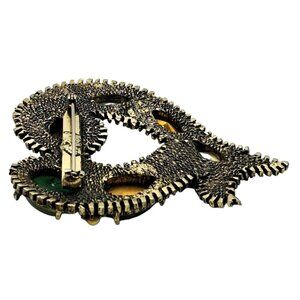 This brooch is large and in charge! Done in the style of Har (Hargo,) this brooch resembles the snake jewelry and appears like it is a stylisticly shaped heart. It has shades of green rhinestones (two with Aurora Borealis,) cabochons, a foiled glass cabochon, and faux or imitation pearls. The setting is like an antiqued brass color. Please note that this is a heavy brooch! It will definitely be best worn on a heavier weight garment. It measures 3" long x 2 3/8" wide. This brooch is in pretty good condition but I do think that the pin mechanism may be a replacement.