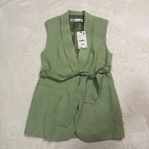 NWT Zara Womens Sage Green Belted Sleeveless Blazer Vest Small