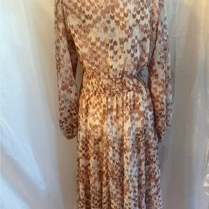 Elegant dress with a V-neck. Features a stylish pattern and elastic waist. Purchased at Bloomingdale’s. Size is XS. Can fit up to Medium 🌸