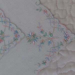 Set of three white handkerchiefs with delicate pastel rainbow floral embroidery and scalloped trim. Perfect for adding a touch of elegance.