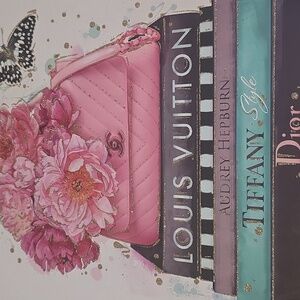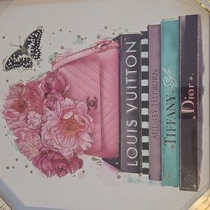 Chic Instinct Style hand emblemished framed art piece featuring a pink purse on a stack of fashion books. Accented with a gold frame and butterfly detail.