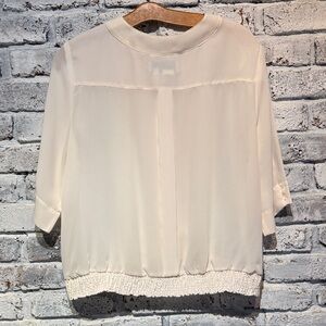 It’s sooo romantic! Vintage classic piece for dressing up casual wear or a more formal look. Great for layering and lightweight for a Spring must have. The pearl like buttons complete the look. Half sleeve. Measurements: PTP 20” length 22” top shoulder to bottom hem. Elastic waist