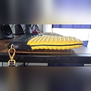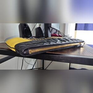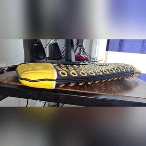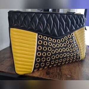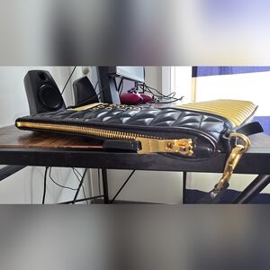 Stylish Miu Miu Nappa Biker Vele Pochette with quilted design. Features bold grommet accents. Perfect for a chic look. Clutch in good used condition. Has a leather quilted detachable wristlet, 1 zip compartment, leather inner lining, 1 inner zip pocket, 1 inner slip pocket. Made of leather and gold toned hardwares. Authentic. Issues: Scratches on hardwares Some rubs on corners and edges Some scuff on inner lining Dimensions: H 20cm × W 34cm