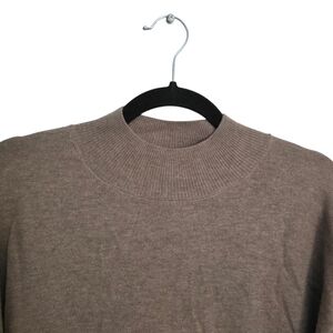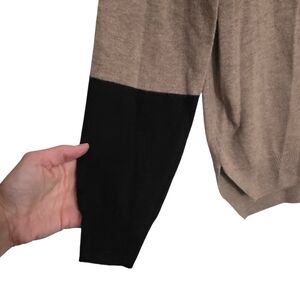 Stay cozy and stylish with this elegant tan and black crew neck sweater. Perfect for any occasion.
