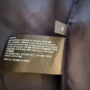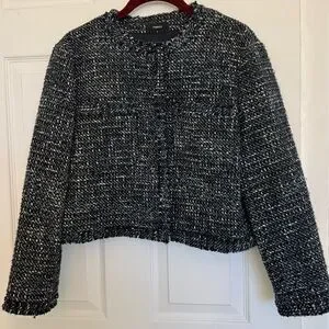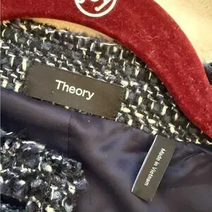 Chic and timeless Theory tweed jacket in a classic blue and white weave. This elegant cropped silhouette features a collarless neckline, textured tweed fabric, and a structured fit that elevates any outfit. Perfect for work, events, or polished everyday wear. Details: