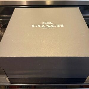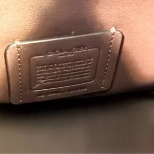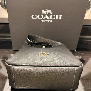 Sleek Coach black leather design shoulder bag with adjustable strap. Turn kiss lock closure. Gold-tone hardware accent. Perfect for versatile styling.