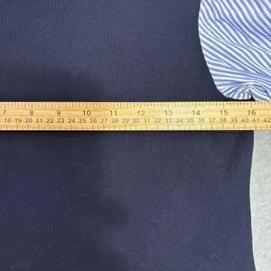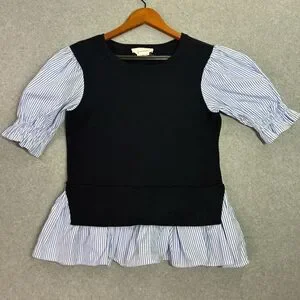Stylish women's top featuring a black bodice with blue striped sleeves. Perfect for a chic and modern look.